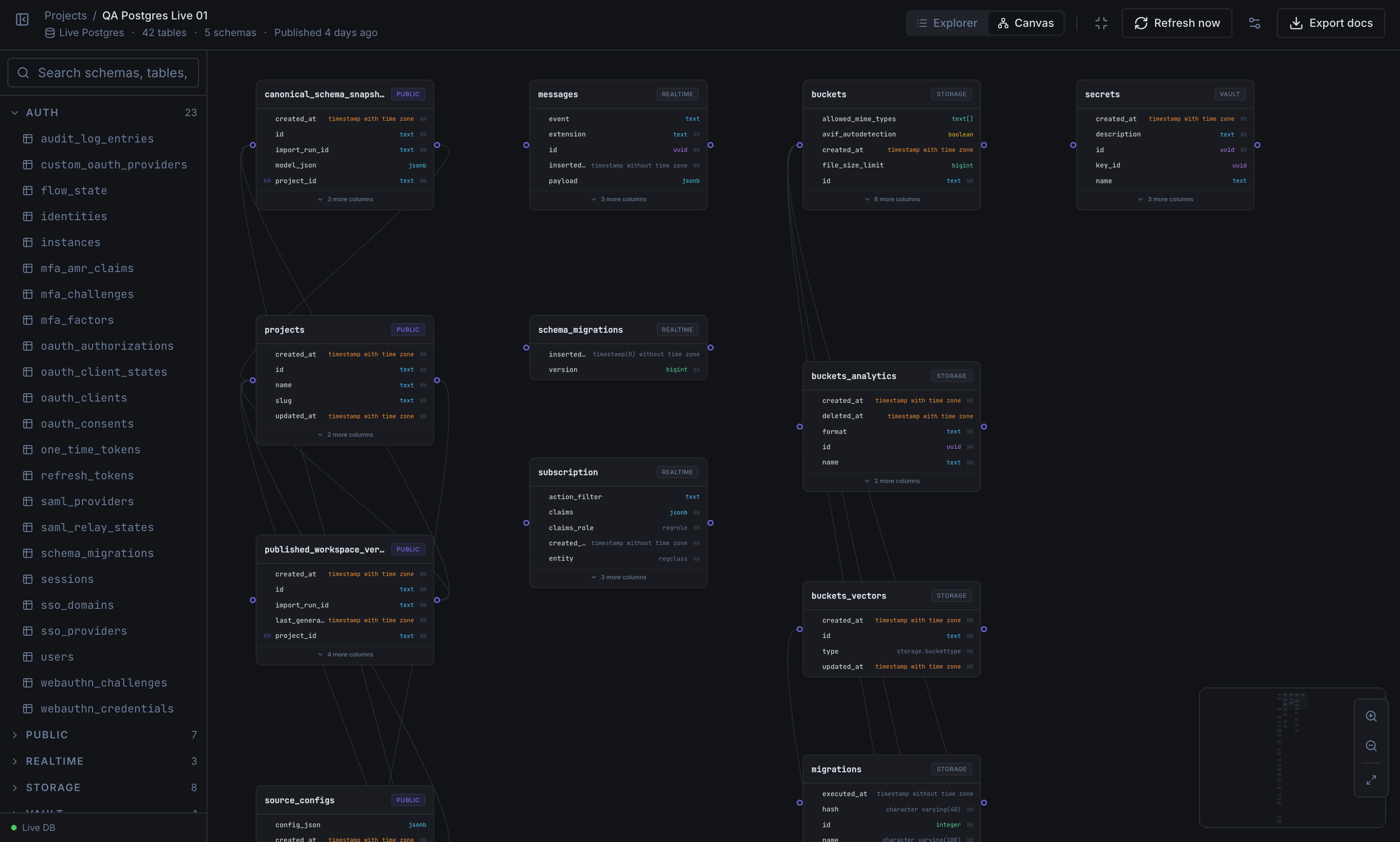 Connect a live Postgres database or import SQL migrations, then open the same published reference your team will actually use.